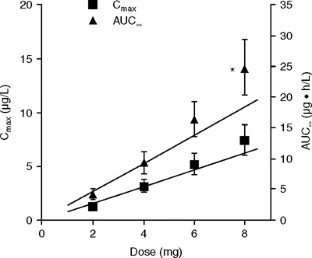 Lacidipine was administered as single doses of 2, 4, 6 and 8mg, and as multiple doses of 2, 4 and 6mg for 8 days. Pharmacokinetic evaluations were performed on study days 1 and 8. Plasma concentrations of lacidipine were determined by a validated high-performance liquid chromatography-radioimmunoassay method. The ratios of dose-normalised peak plasma concentration (Cmax) and area under the concentration-time curve (AUC) were calculated and then compared across dose groups by analysis of variance to assess dose linearity against a 4mg reference dose. A power model was also applied as an alternative method for the evaluation of linearity.