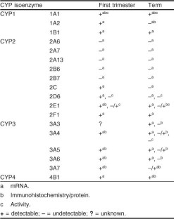 The extent to which drugs cross the placenta is also modulated by the actions of placental phase I and II drug-metabolising enzymes, which are present at levels that fluctuate throughout gestation. Cytochrome P450 (CYP) enzymes in particular have been well characterised in the placenta at the level of mRNA, protein, and enzyme activity. CYP1A1, 2E1, 3A4, 3A5, 3A7 and 4B1 have been detected in the term placenta. While much less is known about phase II enzymes in the placenta, some enzymes, in particular uridine diphosphate glucuronosyltransferases, have been detected and shown to have specific activity towards marker substrates, suggesting a significant role of this enzyme in placental drug detoxification.