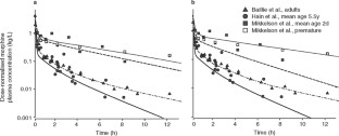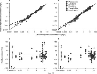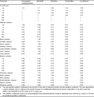 The age-dependence of bodyweight, height, organ weights, blood flows, interstitial space and vascular space were taken from the literature. Physiological parameters that were used in the PBPK model were checked against literature values to ensure consistency. These included cardiac output, portal vein flow, extracellular water, total body water, lipid and protein. Five model compounds (paracetamol [acetaminophen], alfentanil, morphine, theophylline and levofloxacin) were then examined by gathering the plasma concentration-time profiles, volumes of distribution and elimination half-lives from different ages of children and adults. First, the adult data were used to ensure accurate prediction of pharmacokinetic profiles. The model was then scaled to the specific age of children in the study, including the scaling of clearance, and the generated plasma concentration profiles, volumes of distribution and elimination half-lives were compared with literature values.