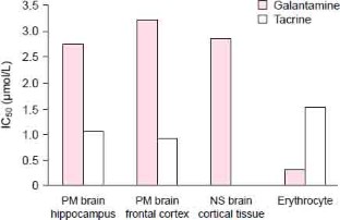 Galantamine, a tertiary alkaloid, is a selective, competitive inhibitor of acetylcholinesterase (AChE). The inhibitor affinity (Ki) of galantamine for AChE in rat striatal tissue was 0.015 μmol/L. In postmortem brain tissue from patients without evidence of psychiatric disorder and fresh cortical brain biopsies from patients undergoing neurosurgery, galantamine inhibited AChE activity in a concentration-dependent manner. In postmortem samples, the concentrations of drug required to inhibit AChE activity by 50% were 3.2 and 2.8 μmol/L for the frontal cortex and hippocampal region, respectively. Tacrine and physostigmine exhibited a higher degree of AChE inhibition than galantamine in these regions of the brain. Galantamine was 10-fold less potent at inhibiting AChE from fresh brain cortex biopsies than from erythrocytes, whereas tacrine exhibited similar enzymatic inhibition levels in tissue from both sources.