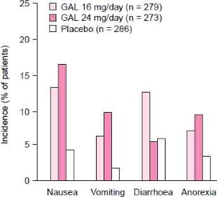 The most common adverse events occurring at least 5% more frequently in galantamine (16 to 24 mg/day) than placebo recipients were nausea, vomiting, diarrhoea and anorexia. The proportion of serious adverse events was similar between galantamine (8 to 32 mg/day) and placebo groups (6 to 16% of patients across treatment groups; nature of events not reported). Notably, the incidence of muscle weakness in galantamine recipients was similar to that observed in the placebo group (0.4 to 1.1% vs 1% of patients). According to the manufacturer’s summary of product information, there was no difference in the incidence of seizures in clinical trials in galantamine recipients compared with placebo recipients. Galantamine had no clinically relevant effects on vital signs or haemato-logical or biochemical laboratory parameters and, importantly, no hepatooxicity was observed.