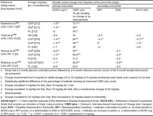 Selection: Studies in patients with mild to moderate Alzheimer’s Disease who received galantamine. Inclusion of studies was based mainly on the methods section of the trials. When available, large, well controlled trials with appropriate statistical methodology were preferred. Relevant pharmacodynamic and pharmacokinetic data are also included.