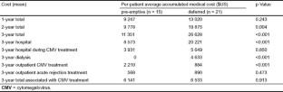 Conclusions: With an average of 16 months’ follow-up and an assessment of CMV-related charges, it was concluded that the deferred strategy was preferred because of equivalent clinical outcomes at lower CMV treatment charges. The results of the current study with 3-year follow-up and an analysis of total post-transplant treatment costs reverses the previous conclusion. We now conclude that a pre-emptive strategy for treating CMV disease is preferred because of similar clinical outcomes with lower total medical costs.