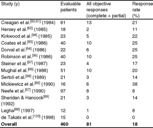 Houghton AN, Legha S, Bajorin DF. Chemotherapy for metastatic melanoma. 2nd ed. In: Balch CM, Houghton AN, Milton GW, et al., editors. Cutaneous melanoma. Philadelphia (PA): JB Lippincott, 1992: 499–508