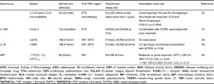 Padyukov L, Lampa J, Heimburger M, et al. Genetic markers for the efficacy of tumour necrosis factor blocking therapy in rheumatoid arthritis. Ann Rheum Dis 2003 Jun; 62(6): 526–9