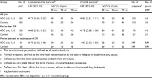 Kolitz JE, Hars V, DeAngelo DJ, et al. Phase III trial of immunotherapy with recombinant interleukin-2 (rIL-2) versus observation in patients <60 years with acute myeloid leukemia (AML) in first remission (CR1): preliminary results from Cancer and Leukemia Group B (CALGB) 19808 [abstract no. 157]. Blood 2007 Nov 16; 110(11): e157
