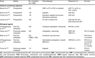 Garber J, Richardson A, Harris L, et al. Neoadjuvant cisplatin (CDDP) in triple negative breast (BC) [abstract no. 3074]. Breast Cancer Res Treat 2006; 100 Suppl. 1
