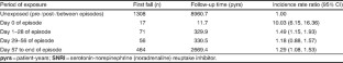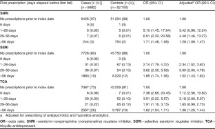 Results: There was an increased risk of current prescribing of SNRIs (adjusted OR 1.79; 95% CI 1.42, 2.25) in first fall cases compared with controls. This was similar in magnitude to that seen with tricyclic antidepressants (TCAs) and selective serotonin reuptake inhibitors (SSRIs). The increase in risk was apparent within the first 28 days after first prescription. The effects were also apparent in the self-controlled case-series analysis, although the magnitudes of effect were slightly smaller; the incidence risk ratio for the period 1–28 days after initiation of treatment compared with unexposed periods was 1.49 (95% CI 1.15, 1.93).