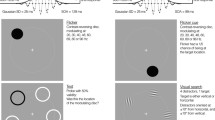 Experiments were run in a dimly lit room. Participants sat ~50 cm from an LCD monitor with a 100 Hz refresh rate (luminance linearized by gamma correction). To maintain viewing distance, participants’ heads were fixated with a chin and forehead rest. All stimuli were presented on a medium gray background. A cue display preceding the target display consisted of eight annuli (1.1° radius, 0.4° width), one surrounding each stimulus location (see Fig. 1). The luminance of each annulus varied sinusoidally over time around mean luminance (gray). Moreover, in order to minimize luminance cues that can occur as a function of stimulus frequency (Bex & Langley, 2007; de Lange, 1958) and may affect visual search, the modulation depth of each individual annulus (Lmax − Lmin/Lmax + Lmin) was randomly selected from a range of ±20% around an average modulation depth of 77%. The starting phase of each temporal modulation was also randomized to exclude predictable phase changes and resulting grouping effects (Spalek et al., 2009).