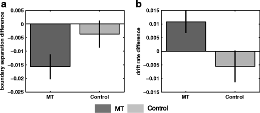 Overall changes in the (a) boundary separation and (b) drift rate parameters of the EZ-diffusion model for the MT and control groups. Error bars reflect the standard errors of the means