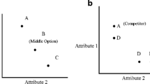 The three standard context effects appearing in the literature—the attraction, similarity, and compromise effects—arise in choices among three alternatives that have two attributes. For example, in a typical consumer goods decision task, participants might be asked to choose among a set of three cars that vary on the two attributes of price and quality. The options can be graphically represented in a two-dimensional attribute space, as is illustrated in Fig. 1. In the figure, the x- and y-axes correspond to the attribute values, and points in the space correspond to different options. Context effects arise from changes in the relative preferences for the options due to their placement in the attribute space. The attraction effect occurs when a dominated option (e.g., option RB in Fig. 1) increases the probability of selecting the dominant alternative (e.g., B). The similarity effect arises when similar options (e.g., SB and B) compete with one another, so that the relative preference for a dissimilar option (e.g., C) increases. The compromise effect occurs when an enhancement occurs in the probability of choosing an intermediate alternative (e.g., C) when extreme options (e.g., B and D) are included in the choice set. More details about the effects are given below within the experiments.