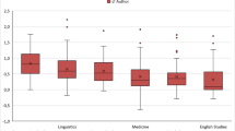 The consistency and predictability of the differences in author difficulty from the early (Stanovich & Cunningham, 1992; Stanovich & West, 1989) to the recent data sets raises the question of how difficulty is related in the recent data sets. As we noted above, there is a high correlation [r(65) = .88] between author selections in the present data and the Acheson et al. (2008) data. Assessment of whether the differences in author difficulty between the two data sets are due to changes over time in the frequencies of the authors’ names is made difficult by the relatively brief period of time between the two studies and because the Google Ngram Viewer used to assess changes in author name frequency only extends through 2008, which means that frequency data were not available for most of the time between the two studies. Although the relative difficulties of author items were highly similar, the overall selection rates of author names were higher in the Acheson et al. study (36 %) than in the present study (24 %). The reasons for this substantial difference are not clear. It seems unlikely that the difference was due to differing admissions standards, since standardized test scores tend to be slightly higher at the University of North Carolina than at the University of Wisconsin.Footnote 6 One possibility is that differences in participant sampling methods caused the difference. The present study tested students from Introductory Psychology classes, which primarily enroll first- and second-year students, whereas the Acheson et al. study recruited paid participants from the larger university community, which may have resulted in a greater proportion of older students who had progressed further in their educations. Finally, it is possible that the test has become harder because some of the authors who were considered sufficiently prominent for inclusion when the test was constructed have become less prominent since the test was constructed. Evidence in support of this possibility comes from a decline over time in ART scores within the present study. On average, participants tested in the first half of the study (fall 2010 through spring 2012) had higher scores than did participants tested in the second half of the study (fall 2012 through spring 2014) (15.3 vs. 14.2), t(1010) = 2.43, p = .015.