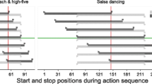 Concerning the selection of the correct action description (question 2), on average, action stimuli were correctly identified by 77 % of the participants (SD= 17 %; range= 26–99 %). Examples of very well recognized stimuli are “Stop” (97 %) and “Imitate me” (99 %) for the communicative action stimuli, and “Jump” (99 %) and “Turn over” (91 %) for the individual action stimuli. Although the overall recognition rate was high, some consistent misidentification occurred. For example, for “Go out of the way,” the incorrect action description “A asks B to come closer. B moves over” was selected by 62 % of the participants. Similarly, 52 % of the participants misidentified “Look under the foot” as “A stretches. B moves something.” Binomial tests revealed that participants performed significantly better than the chance level for 20 out of 21 action stimuli (all ps < .001). Performance was not above the chance level only for the action “Go out of the way” (p = .084).
