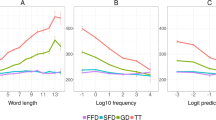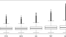 As stated above, MECO is a resource that can be used for pursuing a variety of research questions. For instance, additional work needs to be done on investigating cross-linguistic effects of benchmark predictors of reading behavior, including the effects of word length, frequency, and predictability in context (Rayner, 2009). We expect future MECO updates to incorporate frequency and predictability estimates for most languages and provide analyses that will compare benchmark effects across languages and writing systems. Also, our present focus was on the word-level reading behavior across languages: a follow-up is recommended to tackle cross-linguistic variability at the sentence and passage level. An additional examination of spatial information regarding landing positions and amplitudes of saccadic eye movements will shed further light on the “where” aspect of oculomotor control. Furthermore, we expect analyses relating skill tests in individual languages to the patterns of reading behavior to contribute to the growing literature on individual differences in reading (e.g., Radach & Kennedy, 2013). Another example of an interesting prospective study derives from the finding that skipping versus fixation probability accounts for most of the cross-linguistic differences. Further research may look at whether and how these differences reflect trade-offs between spatial fixation density and reading times (e.g., Radach & Heller, 2000), possibly based on orthographic or morphological complexity of individual languagesFootnote 10.