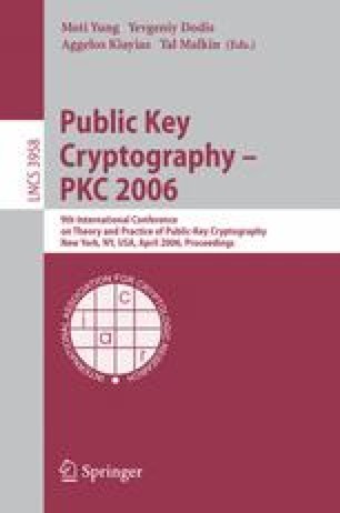 - [DY05]Dodis, Y., Yampolskiy, A.: A Verifiable Random Function with Short Proofs and Keys. In: Vaudenay, S. (ed.) PKC 2005. LNCS, vol. 3386, pp. 416–431. Springer, Heidelberg (2005)Google Scholar