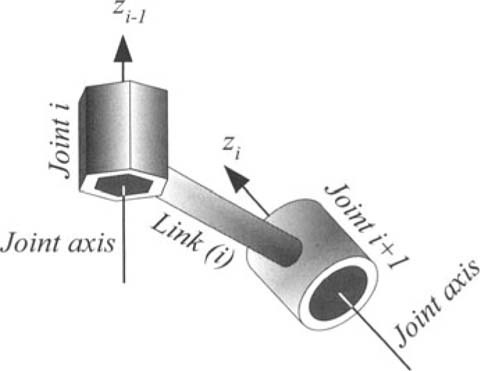 A series robot with n joints will have n +1 links. Numbering of links starts from (0) for the immobile grounded base link and increases sequentially up to (n) for the end-effector link. Numbering of joints starts from 1, for the joint connecting the first movable link to the base link, and increases sequentially up to n. Therefore, the link (i) is connected to its lower link (i − 1) at its proxi7nal end by joint i and is connected to its upper link (i + 1) at its distal end by joint 2 + 1, as shown in Figure 5.1.