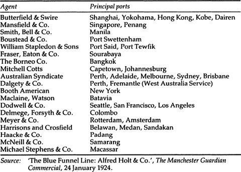 The history of the Blue Funnel Line has been intertwined with that of its agents. Characteristic of the Company’s development has always been its close and long-standing relations with its main agents. Indeed, in the case of two, Mansfields in Singapore, and Stapledons in Suez, Holts were directly responsible for the foundation of the agents’ business in the first place, and in the case of Butterfield and Swire were indirectly responsible. Relations were built up over many years. In all the main ports of call agents appointed in the very early days were retained well into the post-Second World War era, and in many cases the connection has remained unbroken. Table 4.1 below gives a list of Blue Funnel’s principal agents in 1923, though most of them had been appointed at the inception of the particular trade. The principal agents in 1923 were virtually identical with those in 1939, while if we compare agents, or ‘correspondents’ as they were then called, for the same ports in 1902 prior to the absorption of China Mutual, we find still a very similar array of names. The full list of 1902 ‘correspondents’ is given in Appendix III, and it can be seen that Butterfield and Swire represented Blue Funnel at 18 ports (though not yet at Dairen); Port Swettenham had yet to become an established deep-sea port; Windsor and Co., a German firm, was the Bangkok agent (replaced later that year by the Borneo Co. upon Holts’ acquisition of China Mutual); and the Pacific trade (and hence Dodwell’s representation) had not yet commenced.