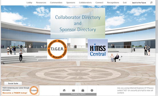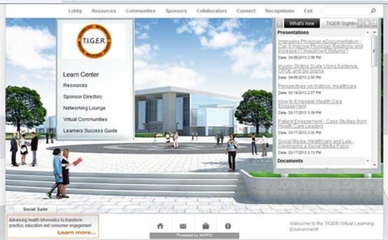 Most recently, TIGER has launched its long anticipated Virtual Learning Environment. TIGER utilized a collaborative workgroup approach to advance education on Health Information Technology (HIT) topics. The TIGER Virtual Demonstration Collaborative workgroup studied the benefits and challenges of a virtual learning environment to expedite innovation and adoption of HIT and identified that a dynamic and sustainable platform was needed to continuously showcase the most effective and efficient current technology-enabled and near future-enabling technologies to advance nursing practice, education and research.