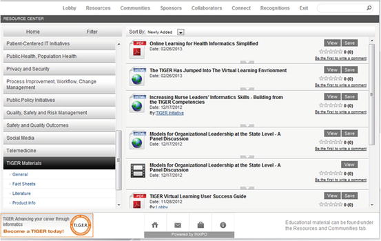 With the launch of the TIGER VLE, the goal is to increase understanding and adoption of health informatics by frontline clinicians, to provide faculty and educators with tools and resources to prepare the current and future health professions workforce, and to engage consumers in the future technology-enabled care environments is now a step closer. The TIGER Initiative Foundation’s Virtual Learning Environment (VLE) provides an interactive web based learning opportunity, which includes information about HIT and related topics for health professionals and consumers. There are a wide range of topics included in the VLE: electronic health records, usability, clinical decision support, health information exchange, care coordination, meaningful use, standards and interoperability, consumer health information, mobile health, privacy and security, exemplars of how health information technology support nursing practice and others. To facilitate adoption of information technologies, the VLE provides not only an opportunity for educational content buts also provide learners with exposure to new and enabling technologies. TIGER has a collaborative approach to engaging with sponsors to demonstrate the use and utility of technology for improving practice and patient outcomes