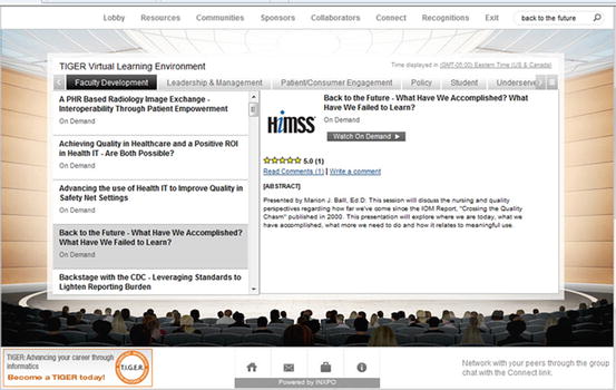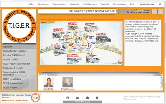 In 2004, David J. Brailer, MD, PhD, appointed to the new position of National Coordinator for Health Information technology, held the first national meeting announcing the Federal Strategic Framework for the Decade of Healthcare Technology. Several influential nursing informatics leaders and nursing informatics advocates attended and noticed that nursing was not included on the panels. The potential implications on nursing were recognized as being significant. Nursing informatics advocates realized that the nursing contribution to achieving these national goals and participating in implementing, improving and sustaining the new health technology infrastructure would not be recognized. This realization was worrying as nurses comprise approximately 55 % of the healthcare workforce and are integral to any transformation that would take place in healthcare. Following this meeting, a small group of nursing leaders and advocates came together and determined that action was required to mitigate this situation. Thus Technology Informatics Guiding Education Reform (TIGER) was created, thereby initiating a grass roots movement, which was essential to transforming nursing practice, leadership and education through information technology [1]. Since then, much as been achieved through this grass roots movement. For example there has been success in the educational environment to recognize the importance of informatics and technology and the contribution to the nursing body of knowledge through publications and presentations has been prevalent (www.thetigerinitiative.org) [2]. TIGER has also been incorporated as a nonprofit foundation and has recently launched its long awaited educational platform, the TIGER Virtual Learning Environment (VLE) utilizing the INXPO Virtual Platform [5]. Complementing this chapter is a tour of the TIGER Virtual Learning Environment and an opportunity to view this resource via a demonstration of the VLE via a short WebEx.