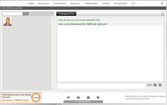 The TIGER VLE also has capabilities to internally privately chat, send emails, play games and earn TIGER recognitions. Virtual business cards may be sent within the environment. Finally, items may be downloaded into your tote bag and saved to your computer.