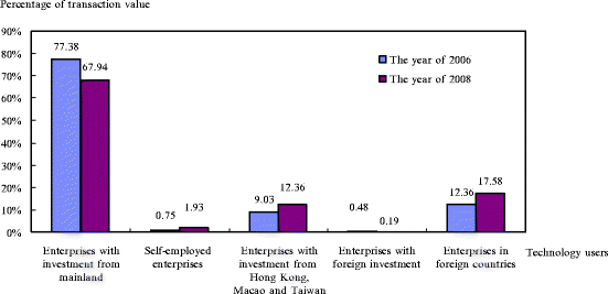 The percentages of transaction values of technology users in the technical market in 2006 and 2008. Note: The raw data are from the Science and Technology Yearbook in 2009