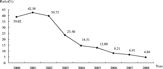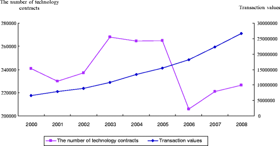 The number of registered technology contracts and their transaction values during 2000–2008. Note: The raw data are from the Science and Technology Yearbook in 2009