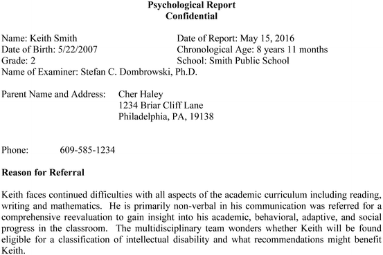 Teacher Interview (May 4, 2016): Ms. Jenny Lincoln, Keith’s second grade teacher, was interviewed regarding Keith’s academic, behavioral, emotional, adaptive, and social functioning. Ms. Lincoln first discussed Keith’s issue with communication noting that he struggles with both expressing and understanding language. She mentioned that Keith struggles to understand the distinction between friendly and unfriendly intent. She noted that Keith often misinterprets social cues. Ms. Lincoln noted that Keith is both oversensitive and undersensitive to social stimuli. She mentioned that other children sometimes try to provoke Keith. Ms. Lincoln explained that Keith is aware of his own deficit and employs strategies to try to hide them. Some of these strategies can be functional in one way (e.g., get him out of work; have him be a leader at something in school) but maladaptive in another (e.g., alienate him from other children). For instance, Ms. Lincoln commented that Keith attempts to frequently be first in line and will bump into and push other children. Ms. Lincoln noted that Keith tries to engage socially with other children, but other children often have difficulty understanding what he is saying. Ms. Lincoln explained that Keith is a friendly child and knows how to approach a group of children, but struggles with sustaining social contact with them. Ms. Lincoln explained that Keith is very good at emulating other children’s behavior, which allows him to blend in with them to some degree. Regarding academics, Ms. Lincoln explained that Keith cannot read or write. She noted that sometimes he struggles with letter recognition and he cannot blend sounds. Ms. Lincoln indicated that Keith knows his one and two digit numbers and can count by fives and tens. Ms. Lincoln explained that Keith is skilled at trying to appear like his peers. She also mentioned that Keith is a friendly child who likes to draw and do art. Ms. Lincoln explained that Keith requires support for difficulties with academics, social progress, and speech.