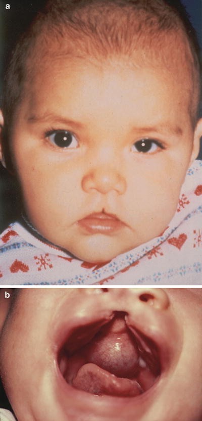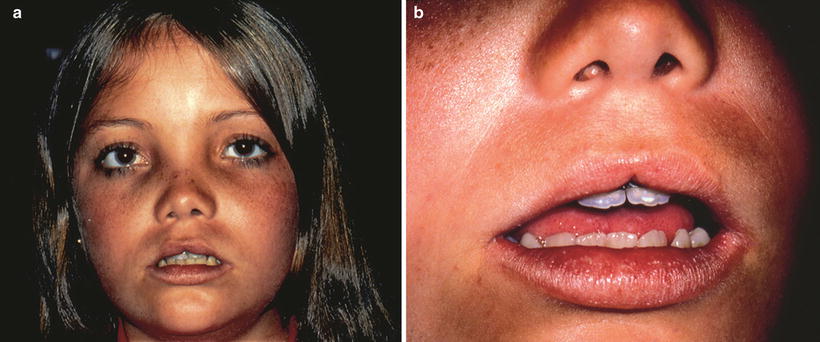 (a) Older patient showing midline cleft in the upper lip, depressed nasal bridge, and mild hypertelorism. (b) Close-up view showing characteristic midline cleft in the upper lip. Used with permission from Brodsky et al. [61]. Photographs courtesy of William F. Hoyt, M.D.