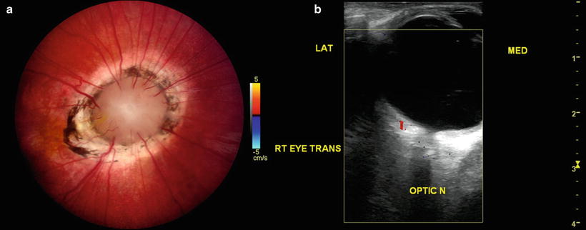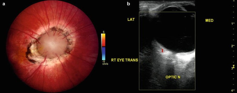 Moyamoya optic disc. (a) In the morning glory disc anomaly, absence of central retinal vasculature gives rise to compensatory collateralization of chorioretinal anastomoses (cilioretinal vessels) to also impart a “moyamoya” bypass system that is ophthalmoscopically visible within the distal optic nerve. (b) Color Doppler ultrasonography demonstrates the absence of vasculature within the central optic nerve. (From Brodsky MC and Parsa CF [64], with permission.)