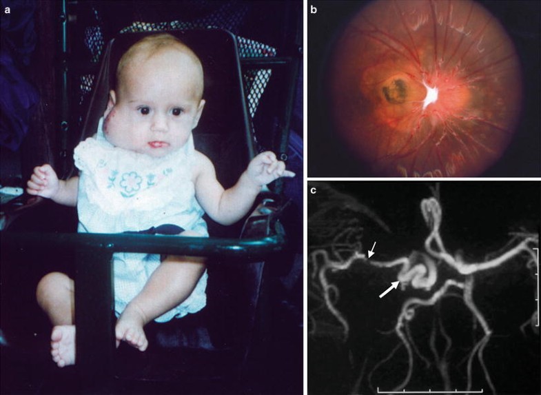 PHACE (posterior fossa malformations, large facial hemangiomas, arterial anomalies, cardiac anomalies and aortic coarctation, and eye anomalies) syndrome. (a) Large facial hemangioma. (b) Morning glory disc anomaly. (c) Magnetic resonance (MR) angiogram showing tortuosity of the right internal carotid artery (open arrow) and narrowing of the proximal right middle cerebral artery (closed arrow). Used with permission from Kniestedt et al. [223].
