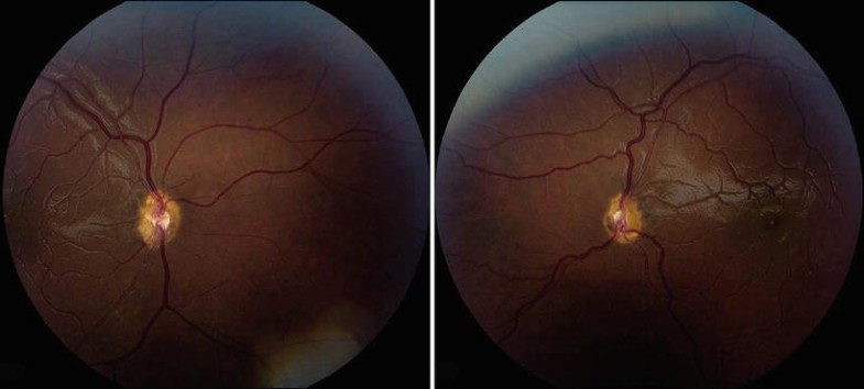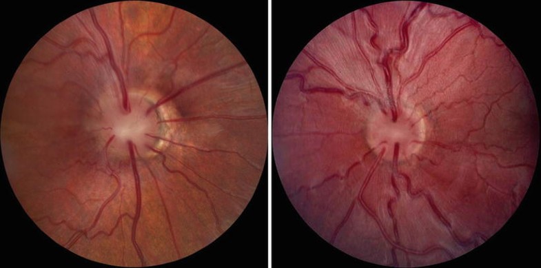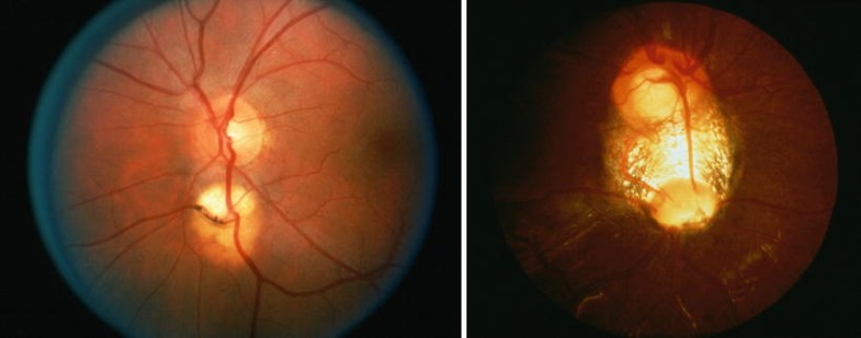 Optic nerve hypoplasia. Note severe bilateral diminution in optic nerve size with “double-ring” sign [231].
