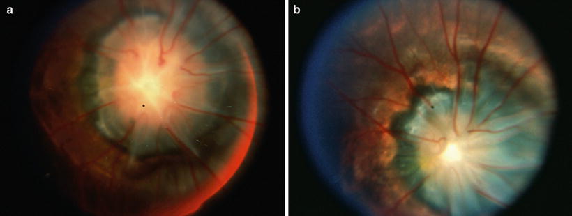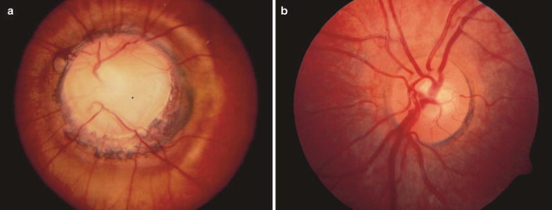 Excavated or cavitated optic disc anomalies include optic disc coloboma, morning glory disc anomaly, and peripapillary staphyloma, megalopapilla, and optic pit. Two new excavated optic disc anomalies have been associated with periventricular leukomalacia (discussed in the previous section) and the vacant optic disc associated with papillorenal syndrome. To our knowledge, no case of normal-tension glaucoma with progressive nerve fiber layer loss has been reported in the pediatric population. In morning glory disc anomaly and peripapillary staphyloma, an excavation of the posterior globe surrounds and incorporates the optic disc, while in coloboma, the excavation obliterates the inferior portion of the optic disc. The inevitable transposition of the terms morning glory disc, optic disc coloboma, and peripapillary staphyloma has propagated tremendous confusion regarding their diagnostic criteria, associated systemic findings, and pathogenesis [46]. It is now clear that optic disc colobomas, morning glory optic discs, and peripapillary staphylomas are distinct anomalies, each with its own specific embryological origin, and not simply clinical variants along a broad phenotypic spectrum [46]. However, all of these disorders may be associated with peripheral retinal nonperfusion [333]. These disorders share a common tendency to develop serous macular detachment due to dynamic pressure gradients between anomalous communications specific extraocular and intraocular spaces. The contributory role of vitreous traction in inciting the cascade of events leading to serous macular detachment is a matter of ongoing debate [202]. Genetic mechanisms producing optic disc excavation have been associated with papillorenal syndrome [286], and others have been mapped to specific chromosomal sites [121]. For example, the autosomal dominantly inherited optic disc excavation with optic disc dysplasia, high myopia, and ovoid-appearing globes has been found to segregate with a deletion a frameshift mutation in the MYC-binding protein gene (MYCBP2), a multifunctional protein that is involved in axonal outgrowth and guidance during visual pathway development [42]. Finally, in microcephalic children, maternal infection with the Zika virus is emerging as an infectious cause of congenital optic disc excavation associated with large patches of chorioretinal atrophy [104].