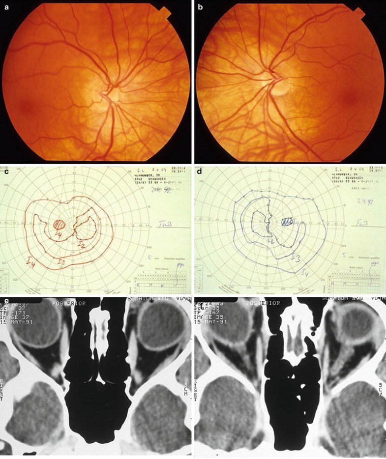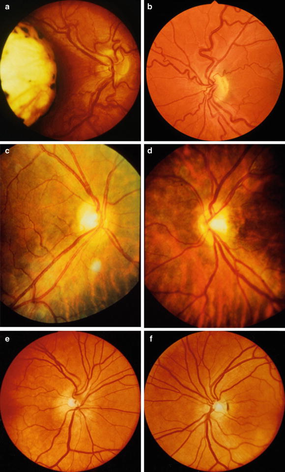 Segmental optic nerve hypoplasia. (a) Segmental hypoplasia of temporal optic disc with focal absence of the temporal nerve fiber layer in patient with “macular coloboma.” (b) Subtle segmental hypoplasia of temporal portion of disc. Child was thought to have amblyopia with 20/400 OS but was refractory to occlusion therapy. (c, d) Chiasmal hypoplasia with congenital bitemporal hemianopia. Note segmental “band” hypoplasia of the nasal and temporal nerve fiber layer bilaterally (Courtesy of William F. Hoyt, M.D.). (e, f) Homonymous hemioptic hypoplasia in patient with right occipital porencephalic cyst. Both optic discs are hypoplastic. Left optic disc (f) shows relative loss of disc substance and peripapillary nerve fiber layer nasally and temporally. With permission, from Novakovic et al. [273]. Photographs courtesy of William F. Hoyt, M.D.