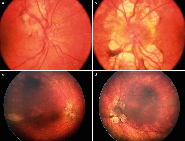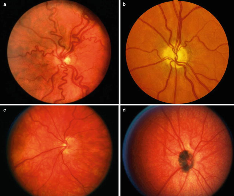 Optic nerve hypoplasia. (a) Optic nerve hypoplasia with selective retinal venous tortuosity. (b) Pseudo-normal optic disc in a child with optic nerve hypoplasia and no light perception. The disc appears normal at first glance but shows complete absence of retinal nerve fiber layer. It is difficult to tell whether central white area corresponds to lamina cribrosa or to hypoplastic and atrophic optic disc. Surrounding area represents extension of retinal pigment epithelium over normal-sized lamina cribrosa, producing double-ring sign. (c) Optic nerve hypoplasia with nasal pallor and extension of retinal pigment epithelium (RPE) and choroid over temporal aspect of disc. (d) Black optic disc caused by optic nerve hypoplasia with congenital optic disc pigmentation.