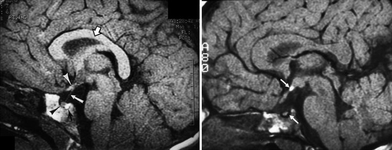 Posterior pituitary ectopia. (a) T1-weighted sagittal MR image demonstrating normal hyperintense signal of posterior pituitary gland (lower white arrow), normal pituitary infundibulum (lower white arrow), optic chiasm (upper white arrow). Open arrow denotes normal corpus callosum. (b) T1-weighted sagittal MR image demonstrating posterior pituitary ectopia (upper white arrow), which appears as abnormal focal area of increased signal intensity at tuber cinereum. Note absence of pituitary infundibulum and absence of normal posterior pituitary bright spot (lower white arrow). Upper white arrow denotes ectopic posterior pituitary gland. This child had a normal septum pellucidum and corpus callosum. Used with permission, from Brodsky and Glasier [58]. Copyright 1993, American Medical Association.