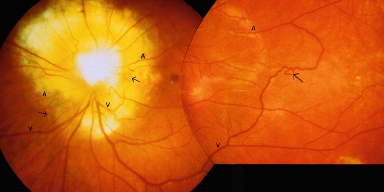 Morning glory disc anomaly with multiple retinal arteriovenous communications (denoted by arrows; A indicates arterioles; V, venules). This child was later found to have neurofibromatosis 2. Used, with permission, from Brodsky and Wilson [66]. Copyright 1995, American Medical Association.