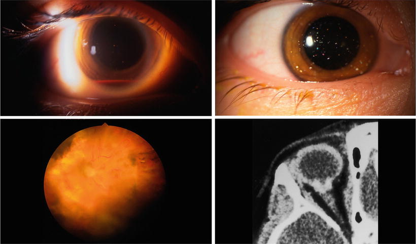 Morning glory disc anomaly with chronic retinal detachment. Top left: Slit lamp photograph of the right eye showing a 10% layered hyphema with sparse multicolored crystals floating within the aqueous. Top right: Slit lamp photograph of the right eye demonstrates multiple, iridescent, needle-like crystals floating freely within the aqueous. Bottom left: Right optic disc photograph demonstrates a morning glory optic disc anomaly. There is a tuft of glial tissue overlying the center of the disc, a slightly elevated yellow annulus surrounding the disc, and a low-lying peripapillary retinal detachment. Bottom right: CT scan showing calcific excavation of the globe at its junction with the optic nerve. (From Brodsky [46, 67], with permission.)