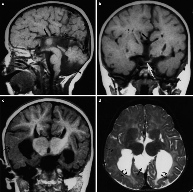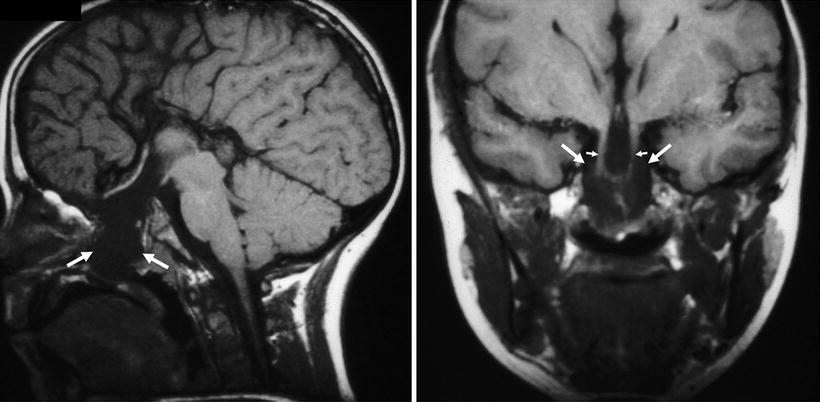 Transsphenoidal encephalocele. (a) T1-weighted sagittal MR image shows an encephalocele extending down through the sphenoid bone into the nasopharynx with impression on the hard palate (white arrows). (b) T1-weighted coronal MR image shows the third ventricle and hypothalamus extending inferiorly into the encephalocele (delimited inferiorly by open arrows). Used, with permission, from Barkovich [19]. Photographs courtesy of A. James Barkovich, M.D.