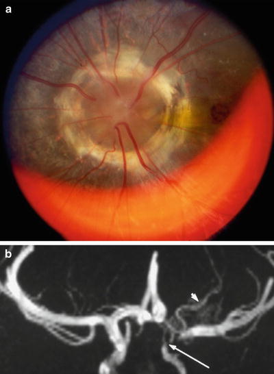 (a) Morning glory disc anomaly in the left eye of a child with PHACE syndrome. (b) Magnetic resonance (MR) angiography shows hypoplasia of the ipsilateral internal carotid artery (large arrow) with moyamoya vessels (small arrow). Used with permission from Massaro et al. [256].