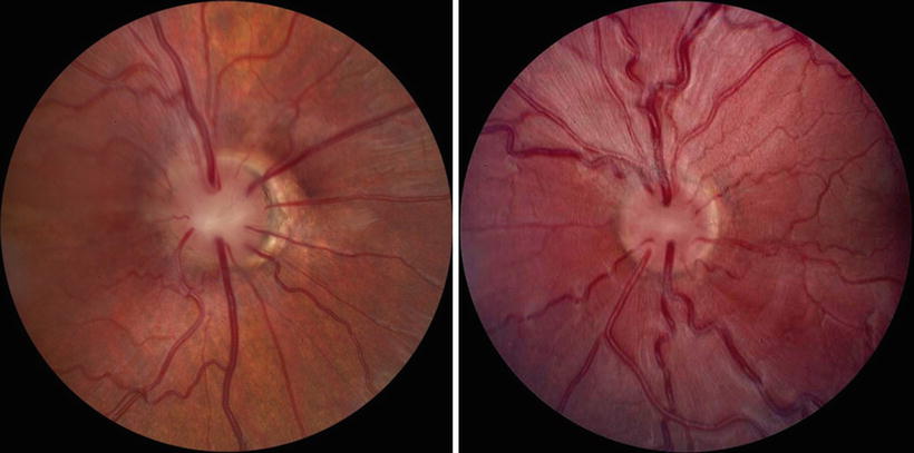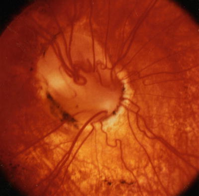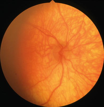 Periventricular leukomalacia produces another segmental form of optic nerve hypoplasia [169, 170]. In 1997, Jacobson et al. [201] recognized that periventricular leukomalacia produces a unique form of bilateral optic nerve hypoplasia characterized by an abnormally large optic cup and a thin neuroretinal rim contained in a normal-sized optic disc (see Fig. 1.20). They attributed this morphologic characteristic to intrauterine injury to the optic radiations with retrograde transsynaptic degeneration of retinogeniculate axons after the scleral canals had established normal diameters. The large optic cups can simulate glaucoma, but the history of prematurity, normal intraocular pressure, and characteristic symmetrical inferior visual field defects all serve to distinguish periventricular leukomalacia from glaucomatous optic atrophy [50]. Most authorities believe that this anomaly warrants classification as a prenatal form of optic atrophy because of its normal optic-disc diameter [50]. Patients with periventricular leukomalacia can also have typical optic nerve hypoplasia [46], albeit one that is not associated with endocrinologic deficiency.