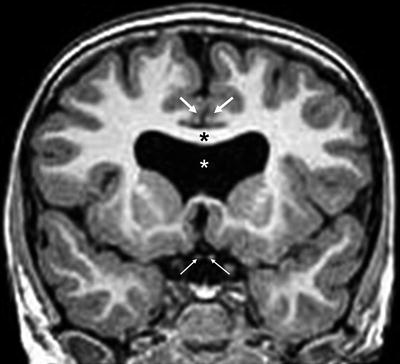 Septo-optic dysplasia. T2-weighted coronal MR image shows absent septum pellucidum (white asterisk denotes normal position) with characteristic squaring of the frontal horns of the lateral ventricles. Both optic nerves are hypoplastic (lower arrows). The corpus callosum (black asterisk) appears normal but there is mild holoprosencephaly with anomalous interdigitations of cerebral gray matter (upper arrows) just above the lateral ventricles.