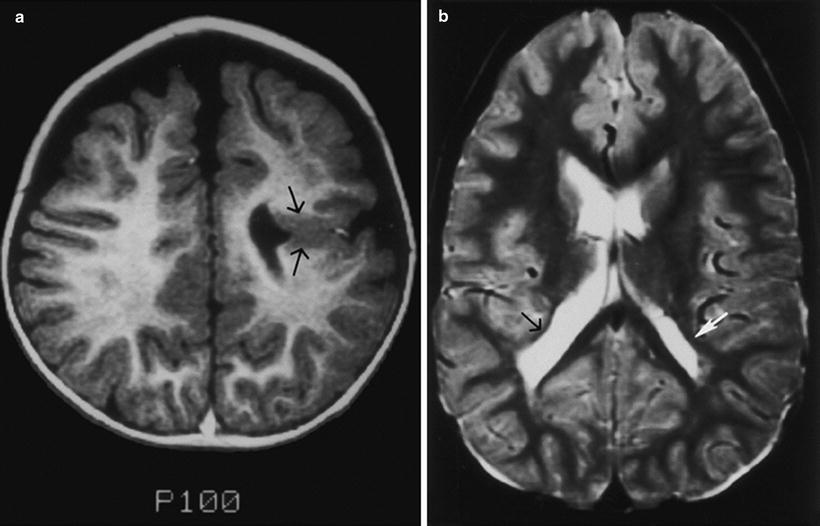 Cerebral hemispheric abnormalities associated with optic nerve hypoplasia. (a) Axial T1-weighted inversion recovery MR image demonstrating schizencephaly in patient with optic nerve hypoplasia. Schizencephalic cleft (arrows) consists of abnormal band of dysmorphic gray matter in left cerebral hemisphere extending from cortical surface to lateral ventricle. (b) T2-weighted axial MR image demonstrating asymmetrical periventricular leukomalacia, worse in right hemisphere (left side of picture), in child with optic nerve hypoplasia. Note enlargement and irregular contour of posterior aspect of lateral ventricle. Black arrow denotes loss of posterior periventricular white matter, with direct apposition of cortical gray matter to trigone of lateral ventricle. White arrow indicates greater volume of posterior periventricular white matter in the left hemisphere. With permission, from Brodsky and Glasier [58]. Copyright 1993, American Medical Association.