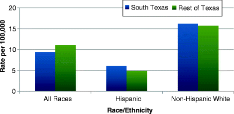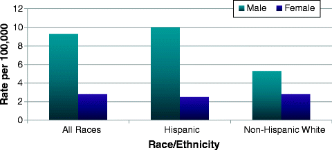 Suicide mortality rates in South Texas by sex and race/ethnicity, 2005–2009. Source: Center for Health Statistics Data Management Team, Texas Department of State Health Services