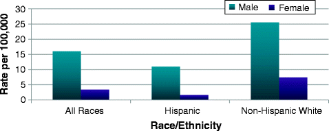 While women are more likely to think about and to attempt suicide, males are nearly four times more likely to die from suicide [16]. In fact, suicide was the seventh-leading cause of death among US males in 2007, and almost 80 % of all suicide deaths occur in males [2, 16]. In 2009, US suicide rates were highest among persons aged 40–59 [7], and higher rates have also been observed among the elderly [15, 16]. Nationwide, non-Hispanic whites have higher suicide rates than all other race/ethnic groups [7]. Risk factors for suicide include previous attempts at suicide, a history of depression, easy access to lethal methods, alcohol or drug abuse, physical illness, and feelings of isolation [17].