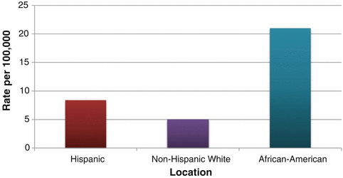 Nationwide, males are more than 3.5 times more likely to die from homicide than females. African-Americans were more than seven times more likely to be murdered than non-Hispanic whites in 2007, and Hispanics also had a higher homicide rate than non-Hispanic whites [13, 14]. US homicide rates are highest among young adults aged 20–24. However, among persons younger than 18, a “U”-shaped trend in homicide is seen, with infants having a significantly higher homicide rate (3.6/100,000) than those aged 5–9 (0.7/100,000) and 10–14 (1.0/100,000) [14]. Other risk factors associated with homicide include living in urban areas, low socioeconomic status, and access to firearms [13, 14].