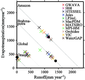 Runoff and evapotranspiration for global terrestrial surface and three major basins calculated from a range of global hydrology and land surface models (see Haddeland et al. 2011 for details)