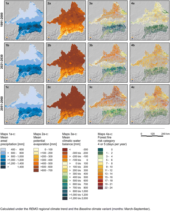 The results of the forest fire module are presented as regional mean values and specialised as maps for the past and a future scenario. The assessment of the future forest fire risk is based on the REMO regional–Baseline climate scenario. Only the months from March to September were analysed, since according to Baumgartner et al. (1967), there is a real risk of forest fires only during the growing season. The conditions in spring (March to May) and summer (June to August) are evaluated separately. A second focus was set on the climatic water balance (the difference between precipitation and potential evaporation), which is considered as a measure of the potential water yield in a region over the long-term average.