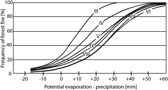 Cumulative curve of frequency of the Baumgartner index (March–September, III to IX) of 1706 forest fires in Bavaria 1950–1959 (Baumgartner et al. 1967)