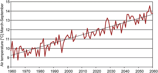 Figure 74.2 shows the trend in mean temperatures within the growing season for 1960–2060. The consistent increase by 4 °C over the course of these 100 years is clearly evident. The highest values to date were recorded in the year 2003 with a mean of 12.0 °C. Such extreme years are likely to occur at greater frequencies over the next 30 years. Although the mean temperature increased by 0.38 °C per decade in the past, the increase per decade under scenario conditions is 0.52 °C, and hence a mean daily air temperature of 14.5 °C is projected.